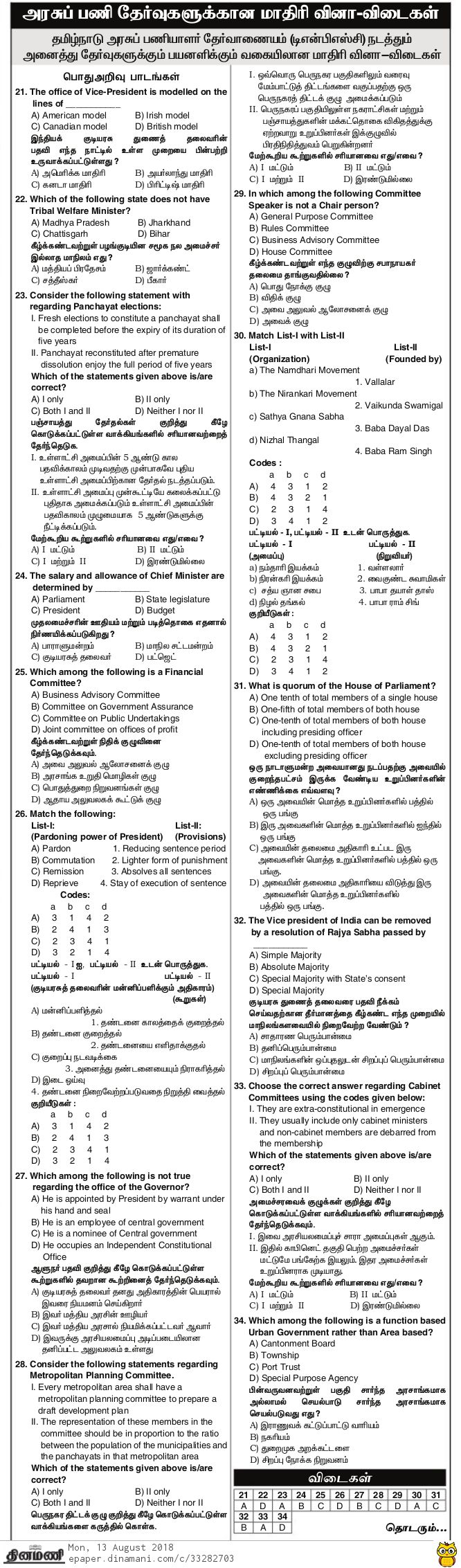 TNPSC Model Question Papers from Dinamani Paper – Day 13