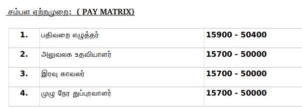 - அலுவலக உதவியாளர் – எட்டாம் வகுப்பு தேர்ச்சி பெற்றுயிருக்க வேண்டும்