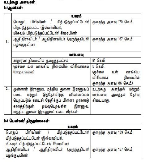 தமிழ்நாடு சீருடை பணியாளர் தேர்வு குழுமம் போலீஸ் கான்ஸ்டபிள் சப்-இன்ஸ்பெக்டர் பணிக்கான உடற்கூறு அளவுகள் பற்றிய முழுமையான விவரங்கள் இந்தப் பதிவில் கொடுக்கப்பட்டது. மேலும் முழுமையான விவரங்களை தெரிந்து கொள்ள இணையதளத்தை பார்க்கவும்.