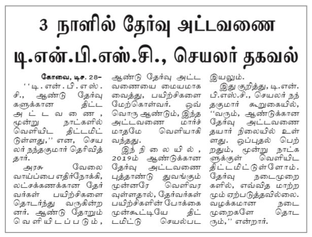 டிஎன்பிஎஸ்சி TNPSC ஆண்டு தேர்வுகளுக்கான திட்ட அட்டவணை இன்னும் மூன்று நாட்களில் வெளியிட திட்டமிடப்பட்டுள்ளதாக செயலாளர் நந்தகுமார் தெரிவித்துள்ளார். தேர்வு எதிர்நோக்கி லட்சக்கணக்கான தேர்வர்கள் பயிற்சிகளை தொடர்ந்து வருகின்ற இந்த நேரத்தில் ஆண்டுதோறும் வெளியிடப்படும் ஆண்டு தேர்வு அட்டவணையை மையமாக வைத்து பயிற்சிகளை மேற்கொள்ள இது பயன்படும்.